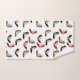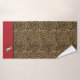 Toalha de banho de moda feita em um salto alto de moda e impressão onça. A toalha de banho é feita em um padrão de pele de gato onça-pintada, marrom e preto, com sotaques pretos e vermelhos numa das extremidades. A toalha da mão é feita em um padrão de salto alto colocado em branco. O pano de lavagem é feito em vermelho sólido. Um par de impressão aguar carregar em cada toalha.