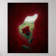 Uma impressionante flor vermelha emergindo através de uma abertura abstrata suave, revelando uma paisagem verde calma além.