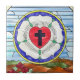 O simbolismo de Luther, o Rosa, data dos anos 1520. Luther explicou que o coração vermelho com a cruz negra representa o justo vivendo pela fé no Cristo dos Crucificados. O coração repousa sobre uma rosa branca, simbolizando a alegria, o conforto e a paz encontradas através da fé. A escolha do branco reflete a cor dos espíritos celestiais e anjos. A rosa branca é colocada contra um campo azul, representando o céu, para significar que alegria e fé terrestres são apenas o começo da eterna alegria celestial. Ao redor do campo azul está um anel de ouro, simbolizando a felicidade infinita e precioso do céu.