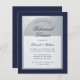 Um janto de ensaio moderno. Em um fundo retangular azul marinho, ele tem um arco azul-prateado falso que tem um marinho de texto azul sobre fundo branco. As palavras Janto de ensaio e os nomes são escritos num guião caligráfico elegante; a primeira linha é o texto arquivado.