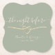 Defina o tom da sua celebração pré-casamento com estes elegantes porta-copos de papel para jantar de rehearsal. Apresentando um fundo verde salvia elegante, um coração de corda dourada romântico e uma escrita elegante que diz “A noite anterior”, este design sofisticado é perfeito para coquetéis ou arranjos de mesa na noite anterior ao seu grande dia.