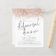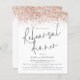 Um valor para o alternativo do ORÇAMENTO em tamanho menor de 4,5 x 5,6" de semirbrilho de 110 lbs, que é de espessura semelhante a um cartão postal (no entanto, não é adequado para uso como cartão postal). POR FAVOR, OBSERVE QUE HÁ UM convite por folha. Rosa de orçamento convite para Janto de ensaio de casamento com Glitter Dourado. Este design moderno tem elegante roteiro informal para Janto de ensaio e o resto da tipografia que você pode personalizar facilmente. O brilho de falso no rosa dourado borda o topo de ambos os lados.