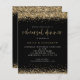 Um valor para o alternativo do ORÇAMENTO em tamanho menor de 4,5 x 5,6" de semirbrilho de 110 lbs, que é de espessura semelhante a um cartão postal (no entanto, não é adequado para uso como cartão postal). POR FAVOR, OBSERVE QUE HÁ UM convite por folha. Janto de Ensaio Dourado de Luminter Preto Convide. As bordas de confete de falso ouro elegantes estão no topo e no fundo e também no verso. O Janto de ensaio é definido num estilo moderno de escrita manual e os outros detalhes abaixo. Personalize facilmente o resto do texto para você.