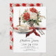 O nosso convite para o janto de Natal apresenta uma elegante zona de janto de férias e um belo arranjo floral de poinsettia vermelha com velas e fita vermelha. O convite é simples e elegante, com fundo branco e texto preto.