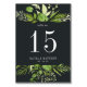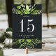 As placas de número de tabela gráfica do jardim apresentam bordas superiores e inferiores de um verde-aquarela pintado vibrante em tons de floresta e verde-férn, moldando seu número de tabela em branco em um fundo preto escuro e elegante. Personalize com seus nomes e data de casamento, ou nomeie cada mesa para um toque pessoal extra. Design repete-se no lado oposto. Coordena-se com a nossa suíte de convite para casamento do Jardim da Meia-Noite.