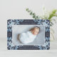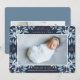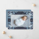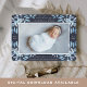 O anúncio de nascimento botânico elegante, em tons chic de azul, apresenta uma foto horizontal ou paisagística de cheio sangrando com solteiros de folhas de cor azul delicadas e poeirentas e bagas brancas nos cantos, contra um fundo de marinho rico. Personalize com o nome do bebê, estatísticas de natalidade e uma mensagem pessoal, e adicione três fotos quadradas adicionais às costas.