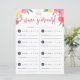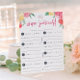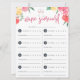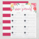 Projetado para combinar com nossos convites de chá de panela de degustação de vinho do Jardim de Rosé, os cartões apresentam flores vibrantes de aquarela colorida com dois copos de vinho tilintando no topo e "cartão de pontuação de vinho" em letra cursiva rosa. Espaço abaixo para notas de degustação e avaliações em oito vinhos.