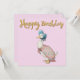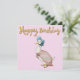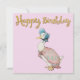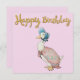 Pato de Jemima Puddle com fundo rosa pastel. Texto "Feliz Aniversário" em ouro.