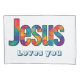 Beautiful colorful geometric design of the name of "Jesus" loves you (personalize message or scripture or name). Great gift for Christians who love the Lord and are proud to be His. This pillowcase fun to give for religious celebrations, events and parties such as baptisms and summer BBQ's.