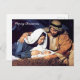 Uma bela imagem de Jesus no presépio com Maria e José olhando por ele. Este cartão-postal seria perfeito para enviar a amigos e entes queridos.