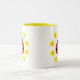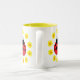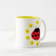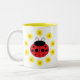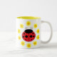 Design pequeno bonito do joaninha com margaridas amarelas em uma caneca de café.
