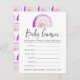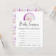 Cartão de caça com chá de fraldas bonito com arco-íris roxo e cor-de-água rosa no topo. A frase "Bebês Adivinhados" aparece em um roteiro de caligrafia moderno. Personalize com instruções personalizadas, critérios de adivinhação e o nome e data de chá de fraldas da futura mãe. O design coordena-se com a nossa Coleção Coxa e Colorida do Arco-Íris e Coloração d'água.