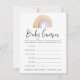 Um cartão de jogo de adivinhação de chá de fraldas bonito com um arco-íris colorido de água no topo. A frase "Bebês Adivinhados" aparece em um roteiro de caligrafia moderno. Personalize com instruções personalizadas, critérios de adivinhação e o nome e data de chá de fraldas da futura mãe. O design coordena-se com a nossa Coleção Coxa e Colorida do Arco-Íris e Coloração d'água.