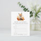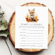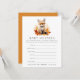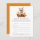 Cartão de caça de adivinhação de chá de fraldas bonito com ilustração aquosa de uma raposa bebê cercada por folhas de outono em tons de laranja, vermelho e amarelo no topo da placa. Personalize o cartão com instruções personalizadas, critérios de adivinhação e o nome e data de chá de fraldas da futura mãe. A design coordena-se com a nossa coleção de chás de fraldas de Animais da Floresta Única.