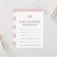 Deixem que os chás de fraldas façam seus melhores palpites na data e hora de aniversário da menina, peso e comprimento! Coloque uma pilha na entrada do evento, passe-as ou deixe uma em cada lugar. Faz uma manga divertida para a mamãe ser, também, quando compilada em uma caixa bonito ou um encadernador. Design apresenta um coração cor-de-rosa pincelado no topo com uma moderna inscrição a preto e um padrão de riscas brancas e pinceladas no lado oposto.