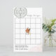 Jogo de bingo de bebê com direções no topo e com quadrados 5x5 e galinha com pintinho de bebê no centro com designs de boho nos cantos. Pintinho bebê está vestindo arco rosa.
