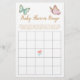 Divirta-se no seu chá de fraldas com este cartão de jogo bingo. Ilustração de borboletas cor-de-rosa e verde-menta com bordas falsas de ouro. O jogo de bingo aos hóspedes para adivinhar quais os presentes que as mamães irão receber. Ilustração original e design do Namibear Art Studio. ©BELGA_REDE