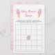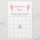 Divirta-se no seu chá de fraldas com este cartão de jogo bingo. Ilustração de sorvete rosa e roxo em um cone de waffle. O jogo de bingo aos hóspedes para adivinhar quais os presentes que as mamães irão receber. Ilustração original e design do Namibear Art Studio. ©BELGA_REDE
