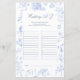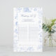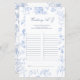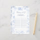 Adicione charme atemporal ao seu chá de noiva com esta elegante folha de jogo de Casamento de A a Z, projetada para combinar com nosso conjunto de Chá de Noiva Blue Toile. Inspirado nos clássicos padrões franceses toile de Jouy, este cartão apresenta delicadas flores azuis e estilo vintage para uma celebração refinada e “algo azul”.