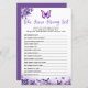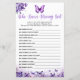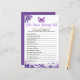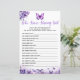 Crie memórias duradouras com nosso Jogo do Chá de fraldas da Borboleta que conhece melhor as Mamães. Apresentando uma linda borboleta roxa voando através de um jardim floral roxo, este jogo permite que seus hóspedes testem seu conhecimento sobre as mamães de uma forma divertida e emocionante. Parte da Coleção de Chás de fraldas da Borboleta Púrpura, este charmoso jogo adiciona um toque elegante e pessoal à sua celebração, fazer-a uma experiência encantadora para todos.