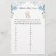 Este cartão de chá de fraldas de rapaz é adequado para qualquer jogo/atividade por alfabeto. O design inclui um ursinho de cor d'água com arco azul e uma borda floral. O cartão diz, "escreva um nome de bebê para cada letra do alfabeto. A primeira pessoa a anunciar que terminou, ganha o jogo! Boa sorte!"