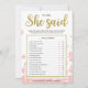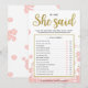 Este jogo moderno de chá de noiva "Ele Disse Ela Disse" apresenta um fundo floral rosa com respingos de glitter dourado. O texto é escrito em uma mistura de uma fonte de caligrafia divertida e uma fonte sans moderna, este cartão Ele Disse Ela Disse é personalizado com o nome da Noiva e a data do Chá de Noiva.