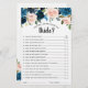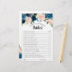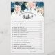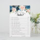 Cartão de jogo azul-marinho escuro de chá de panela floral "Como você conhece bem a noiva?" com buquê elegante de marinho azul, azul real, branco, rosa esbranquiçado e folhas verdes de eucalipto sábio. Entre em contato comigo para obter ajuda sobre a personalização ou se você precisar de outro produto com este design.