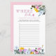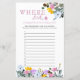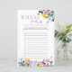 Cartão de jogo de chá de panela, personalizado com os nomes da noiva e do noivo. O design tem uma borda floral de flores silvestres em amarelo-lilás rosa e azul com bonito inscrição rosa. Projetado para o jogo de fotos de casamento ou chá de panela "onde eles estavam" ou "aonde eles foram" com linhas numeradas para seus convidados somarem até 12 respostas.