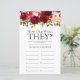 Esta linda floral burgundy Quantos Anos Eles Tinham? A folha de chá de panela é elegante e encantadora - perfeita para qualquer jardim, botânica, rústica, romântica, floral, formal ou casamento vintage. Sua combinação requintada de flores rosadas e arrojadas e rosas, e verde sábia é florida, delicada e bonita. Este jogo fácil e divertido traz muitas risadas a qualquer chá de panela! Peça a familiares e amigos que lhe enviem fotos da noiva e do noivo em todas as idades e que as façam imprimir. Numerá-los e colocá-los perto destas folhas de jogo. Basta dar uma folha a cada convidado (não se esqueça das canetas) e deixar a competição começar! Ficará surpreso com quantas pessoas conhecem realmente a idade da noiva e do noivo. Em segundos você pode ver como sua folha de jogo ficará. Basta selecionar Personalizar este Modelo e digitar os nomes da noiva e do noivo.