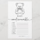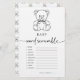 Um jogo sofisticado, simples e elegante, "Bebê word scramble", desenhado para um ursinho de peluche chamado chá do bebê, adorado com um charmoso ursinho desenhado à mão com o arco fofo. Envolva seus hóspedes com este jogo delicioso, perfeito para adicionar diversão e entusiasmo à sua celebração enquanto cria memórias queridas. Respostas: 1. fralda 2. Bocal 3. Pacificador 4. Fórmula 5. gravidez 7. Cisterna 8. cadeirinha 9. frasco 10. viveiro