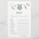 Um jogo clássico sofisticado "Bebê word scramble" desenhado para um chá de menina, adorado com um lindo vestido de menina, calçados, brinquedos e folhas verdes de eucalipto. Envolva seus hóspedes com este jogo delicioso, perfeito para adicionar diversão e entusiasmo à sua celebração enquanto cria memórias queridas. Respostas: 1. fralda 2. Bovinos 3. Pacificador 4. Fórmula 5. gravidez 7. Cisterna 8. cadeirante 9. frasco 10. berçário 11. bassinet 12. contrações