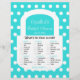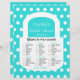 Você precisa de um que está no seu jogo de chá de panela? Bem, esta é divertida. O design apresenta uma bolsa branca e bonita com fundo azul-turquesa sobre o qual aparecem bolinhas brancas. O que está em seu jogo de bolsa tem valores de pontos diferentes para diferentes itens e depois um lugar para o total de pontos. Você pode até mesmo personalizar o jogo com o nome da noiva e a data. Este é um jogo divertido para começar todos a sorrir no chá de panela. Direitos autorais