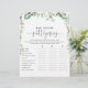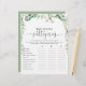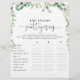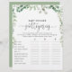 Este jogo verde de histórias de chá de fraldas de eucalipto é uma atividade divertida perfeita para um chá de fraldas simples. O design apresenta galhos e folhas botânicas elegantes e desenhadas a aquarela, desenhadas à mão, adornando quadros geométricos.