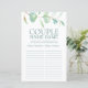 Esta folha de jogo de nomes de casal LGBTQ de eucalipto botânico trará muita diversão e risadas para o seu chá de casamento! A página é ao mesmo tempo elegante e moderna. Seu belo design com uma peça de eucalipto em estilo aquarela contemporâneo é perfeito para qualquer casamento. Para personalizar este jogo, basta selecionar Personalizar este modelo e digitar os nomes do casal feliz.