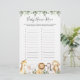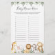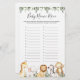 Os animais Safari com o cartão de jogo de corrida de nomes de chás de fraldas apresentam uma ilustração de animais safari com cores aquáticas e verde-aquarelas eucalyptus garland e uma elegante fonte de estilo manuscrito.