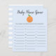 Um cartão de jogo de nome de bebê de chá de fraldas, de tema bonito e bonito, com ilustrações de uma fruta laranja. Os textos são editáveis. Um jogo perfeito para jogar durante o chá. aos hóspedes para anotar nomes de bebês que começam com cada alfabeto. Quem termina todos os alfabetos primeiro ganha!