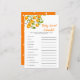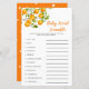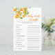 Uma pequena e bonita chá de fraldas, com uma placa de palavras de bebê, com uma ilustração aquosa da fruta laranja de uma árvore. A lista de palavras neste cartão está relacionada com bebês e eles estão embaralhados. Os hóspedes vão competir quem pode desembaraçar todos eles primeiro! CHAVE DE RESPOSTA: 1. cadeirinho 2. leite 3. caneta de recreio 4. pacificador 5. fralda 6. cadeira de balanço 7. berçário 8. baby monitor 9. pastilha 10. fórmula 11. rolete de borracha 12.