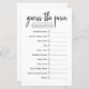 Adicione diversão e risos ao seu chá de fraldas com esta moderna folha de jogos "Adivinha o Preço". Apresentando um design simples e limpo, este jogo desafia os hóspedes a adivinhar o custo de bens essenciais para bebês populares, como fraldas, garrafas, toalhetes e muito mais. Perfeito para manter os convidados entretidos, este cartão de jogo é fácil de jogar e funciona bem para qualquer tema — chás de fraldas neutros em termos de gênero, clássicos ou modernos. Um separador de gelo de excelente e os itens são presentes utilizáveis adicionais para a futura mãe.