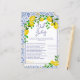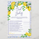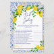 Adicione um elemento extra de diversão ao seu chá de fraldas com nosso jogo de perguntas inspirado italiano-mediterrânico apresentando nosso encantador padrão de azulejo de cerâmica azul e alegre design de limões amarelos-verdes-pintados manualmente. Este novo e moderno convite para jogos neutros em termos de gênero certamente impressionará seus convidados com sua forma de arco de tendências e seu elegante roteiro de pincel. Prepare-se para entreter e engajar seus hóspedes com esta adição única e na moda à celebração do seu chá de fraldas!