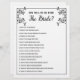 Não quer imprimir seus próprios jogos de chá de panela? Use esses folhetos com perguntas editáveis. Peça a quantidade necessária; Jogo de Chá de Panela "Quão Bem Você Conhece a Noiva?" com perguntas editáveis. Sugiro digitar suas perguntas em um editor de texto como o bloco de notas ou word e copiá-las e colá-las nesta caixa de texto. Duplique o espaço entre as perguntas e use letras maiúsculas para este "visual". Você também pode alterar a cor do folheto para combinar com o seu chá de panela usando as amostras de fundo e a ferramenta conta-gotas. Uma versão com perguntas fixas também está disponível aqui: