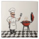 "jolly chef grilling hamburgers", "cook red BBQ barbecue", "chefs hat barbeque bugers", "black and white diamond floor", "meat burger grill kitchen fun", "cooking themed ceramic tile", "beige cream light neutral", "happy smiling face smile", "moustache mustache italian man", "french gourmet professional staff"