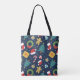 Carregar a alegria do feriado com **Jolly Jumble Holiday Tote Bag**! Esta bolsa divertida e festiva apresenta gráficos de Natal vibrantes, incluindo coroas, ornamentos, meias e pão de gengibre em um fundo azul escuro, perfeito para todos os seus compras e aventuras de férias.