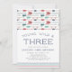 Adoráveis convites para seu terceiro aniversário selvagem têm uma fronteira de setas coloridas com penas em marinho, lacre e vermelho. "Jovem, selvagem e três" aparece em letras azuis marinhos, com seus detalhes festas de aniversário embaixo.