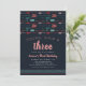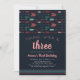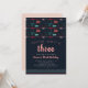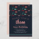 Adoráveis convites para o seu terceiro aniversário selvagem têm uma fronteira de setas coloridas com penas em marinho, lacre e pêssego. "Jovem, selvagem e três" aparece em letras de pêssego, com seus detalhes de festa de aniversário embaixo.