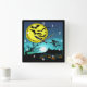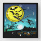 A jovem bruxa voando entre o relógio da noite do céu. Na luz azul da noite à meia-noite, esta jovem bruxa está a apanhar o seu voo. É uma lua amarela cheio, com morcegos e lanternas.