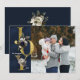 O tempo lá fora é assustador, mas este cartão é tão encantador! Lindas flores botânicas azuis e brancas de inverno, cones de pinho e uma inscrição em ouro na moda verde adorando esta carta com uma vibração rústica quente e acolhedora. Personalize com sua própria mensagem e sua foto favorita da família.