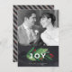 Um moderno cartão com fotos Natal/Feriado com verde festivo e bagas, e o texto tipográfico "Alegria". Um lado inverso coordenado com listras e bagas. Fácil de editar ou excluir o campo de texto na frente para atender às suas necessidades pessoais e mudar a foto para a sua. Os adesivos correspondentes e as etiquetas de endereço estão disponíveis, visite o meu compro.