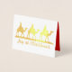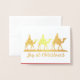 Três homens sábios cartões de Natal com ouro, ou prata, folha. Cartões dobrados têm papel na frente. Os sábios andam camelos sobre um fundo branco na frente dos cartões horizontais. O texto é "Joy at Christmas" (Alegria no Natal), também em letra de folha. Dentro, as cores são vermelhas com texto branco para a mensagem e assinatura. No topo, as estrelas cintilantes e cintilantes são o fundo de um painel branco com texto vermelho. A escritura cristã é, "Quando eles viram a estrela eles estavam cheios de alegria!", do livro de Matthew. Mais estrelas na parte de trás do cartão. Comprar em três tamanhos, com envelopes que vêm em três seleções.