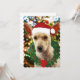 Uma pintura digital de um filhote pronto para o Natal com uma coroa, chapéu de Papai Noel e uma árvore decorada.