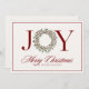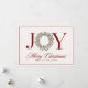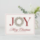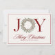Design de cartão clássico de Natal com a palavra JOY em vermelho festivo e uma coroa de festas. A parte traseira do cartão vem com Cartões de natal prontos que você pode guardar ou personalizar com sua própria mensagem pessoal. Todas as cores são totalmente editáveis, para que você possa alternar para ouro, verde, marinho ou qualquer sombra que corresponda ao seu estilo de feriado. Um cartão eterno e elegante para enviar desejos de férias calorosos a familiares, amigos e colegas de trabalho.